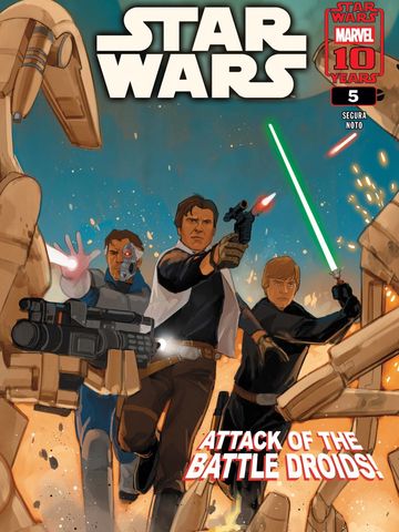 THE PAST RETURNS! As LUKE, RYNN, HAN and VALANCE race to find a group of stranded traders - they uncover a startling, and deadly, relic from the past - and have to face off against a horde of BATTLE DROIDS! LEIA and MON MOTHMA face an unexpected and powerful attack! Who is the new leader of the Nagai resistance? Cornered on a desolate planet, our heroes are left with one shocking option to survive!
